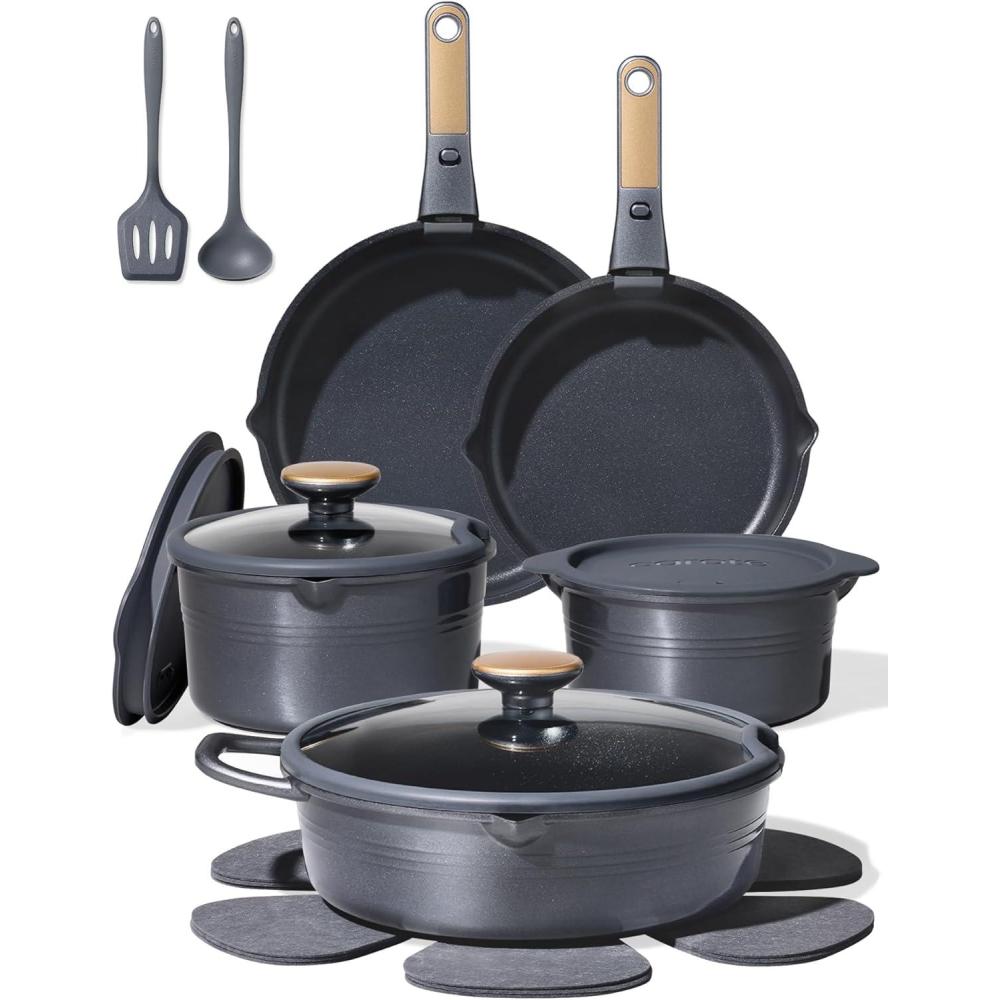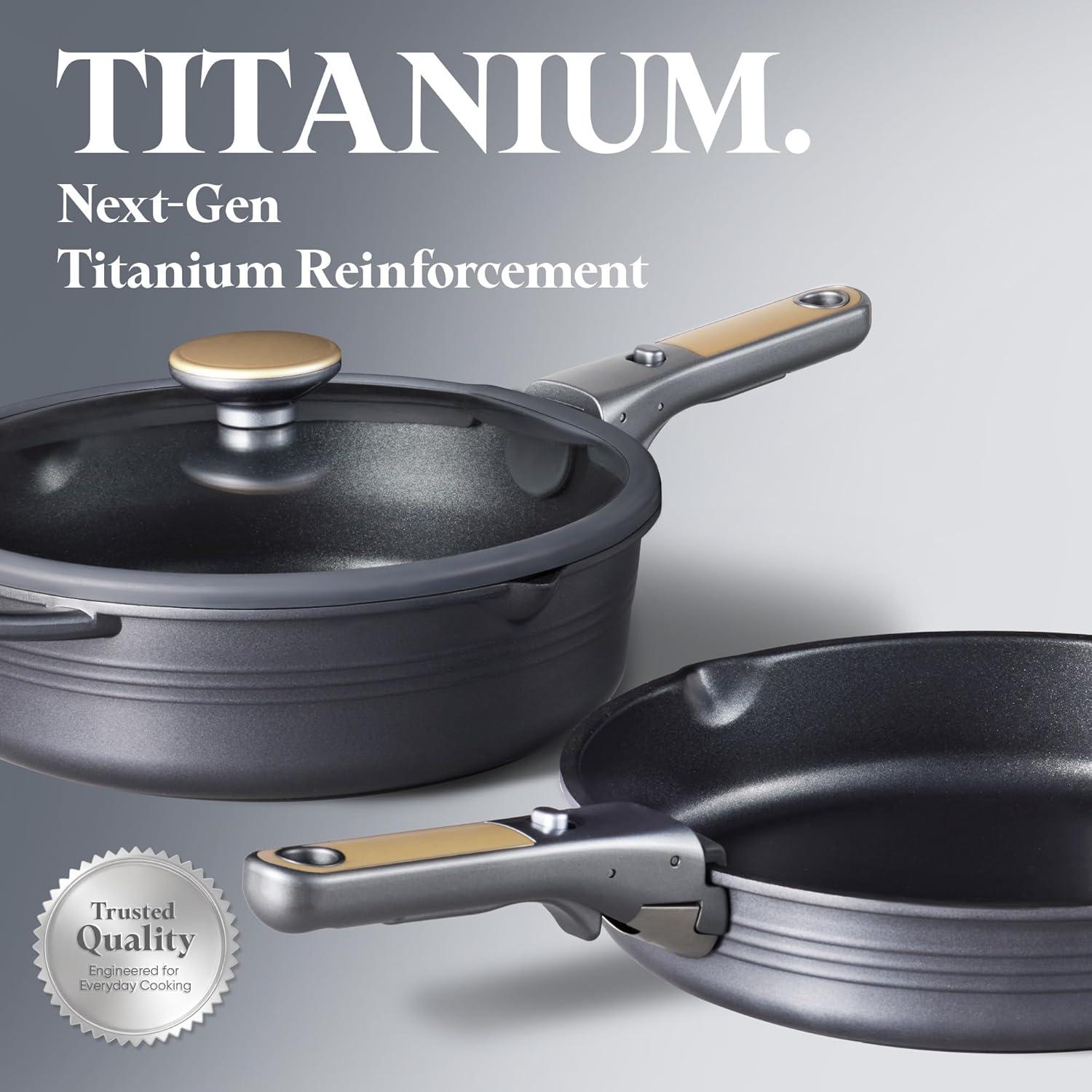 Nonstick Titanium Surface: Crafted with next-generation titanium, our kitchen cookware set is free of PFAS, PFOA, PFOS, and other harmful chemicals. Enjoy safe and easy cooking with this durable set, featuring a stronger nonstick coating that's built to last