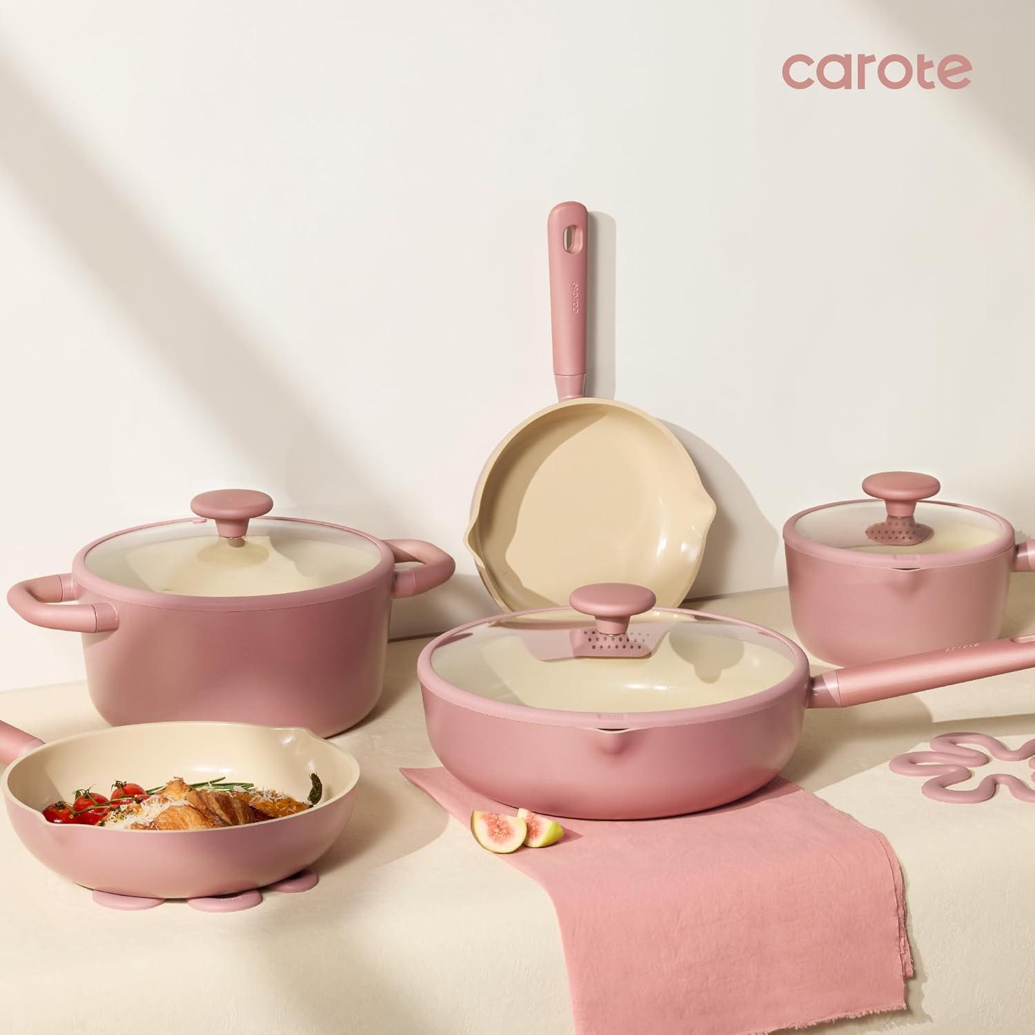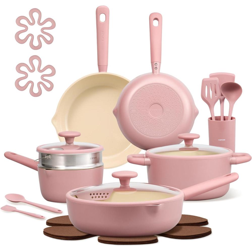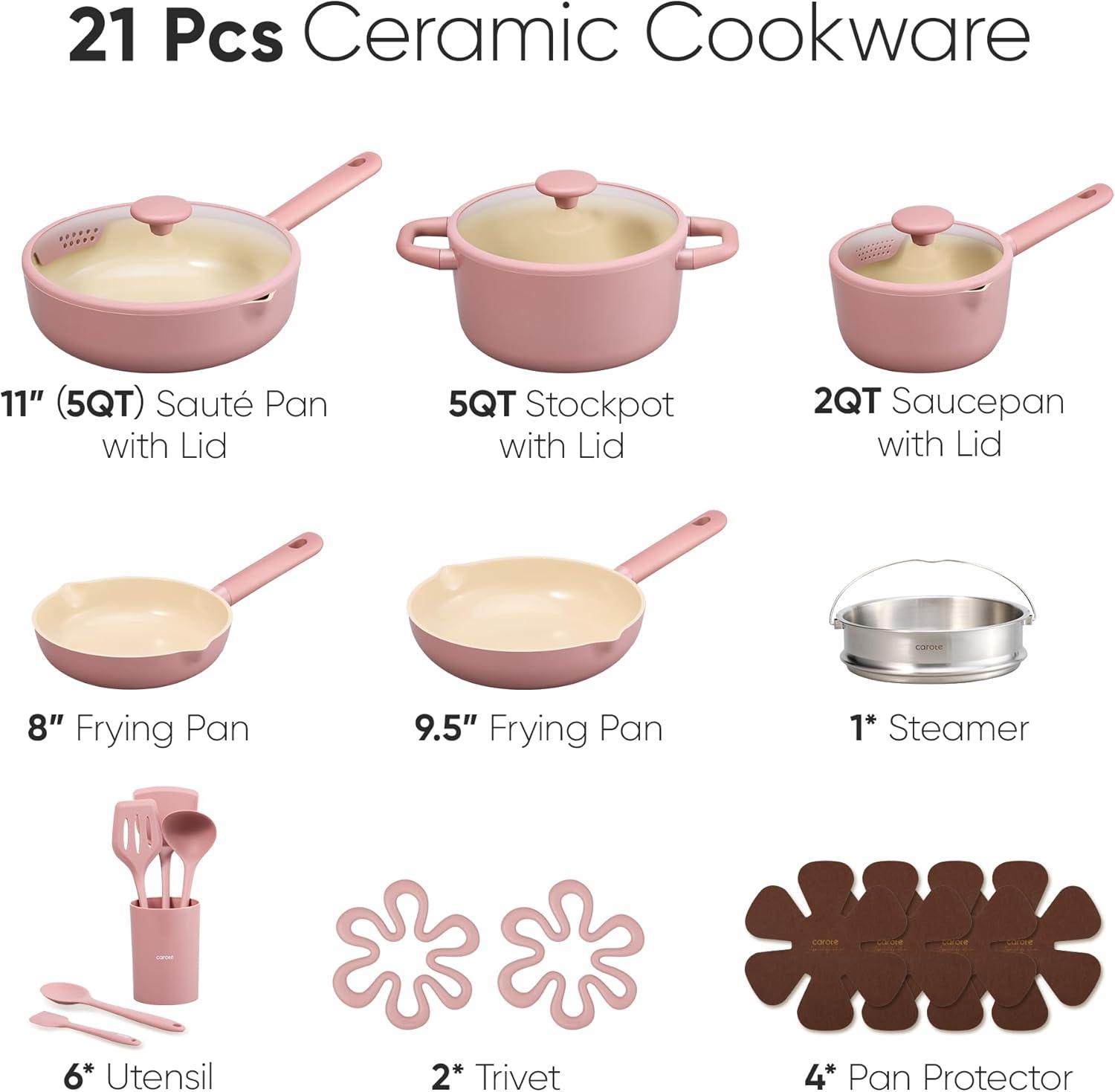 CAROTE 21pcs Cookware Set Nonstick Pots and Pans Set, Ceramic Cookware Set Induction Cookware, Non toxic Healthy Non Stick Kitchen Cooking Set, PFAS PTFE Free(Pink)