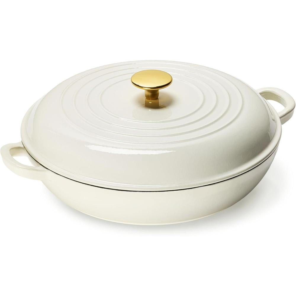 Classic Design: Carote enameled cast iron pot features a porcelain-enameled shell and a spray-painted finish for durability and stylish aesthetics that complement any kitchen. Our shallow braiser pan features sturdy double handles and a matching lid, and its ergonomic design makes it easy to move from stovetop to oven.