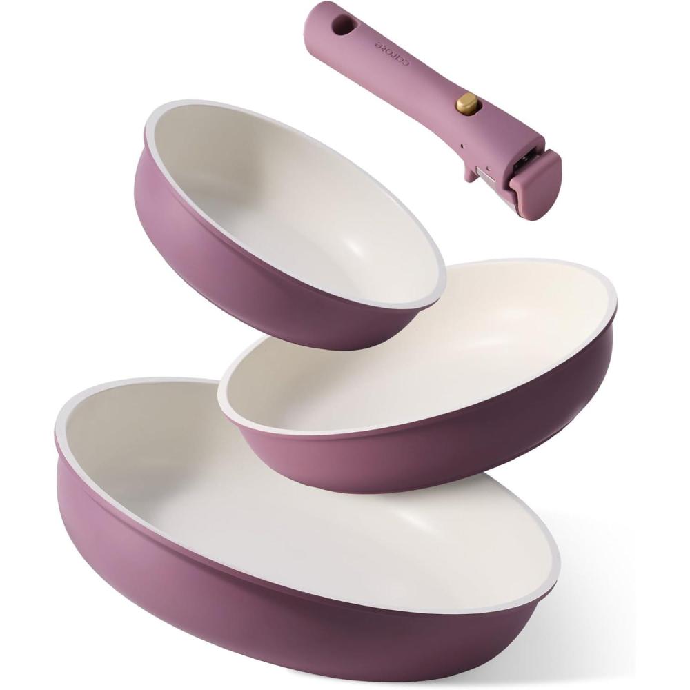 CAROTE 4pcs Non Stick Frying Pans, 8″+10″+12” Frying Pan Egg Pan Omelet Pans with Detachable Handle, Nonstick Cookware, PFOA Free, Induction Compatible & Oven Safe, Dishwasher Safe, Red(Purple)
