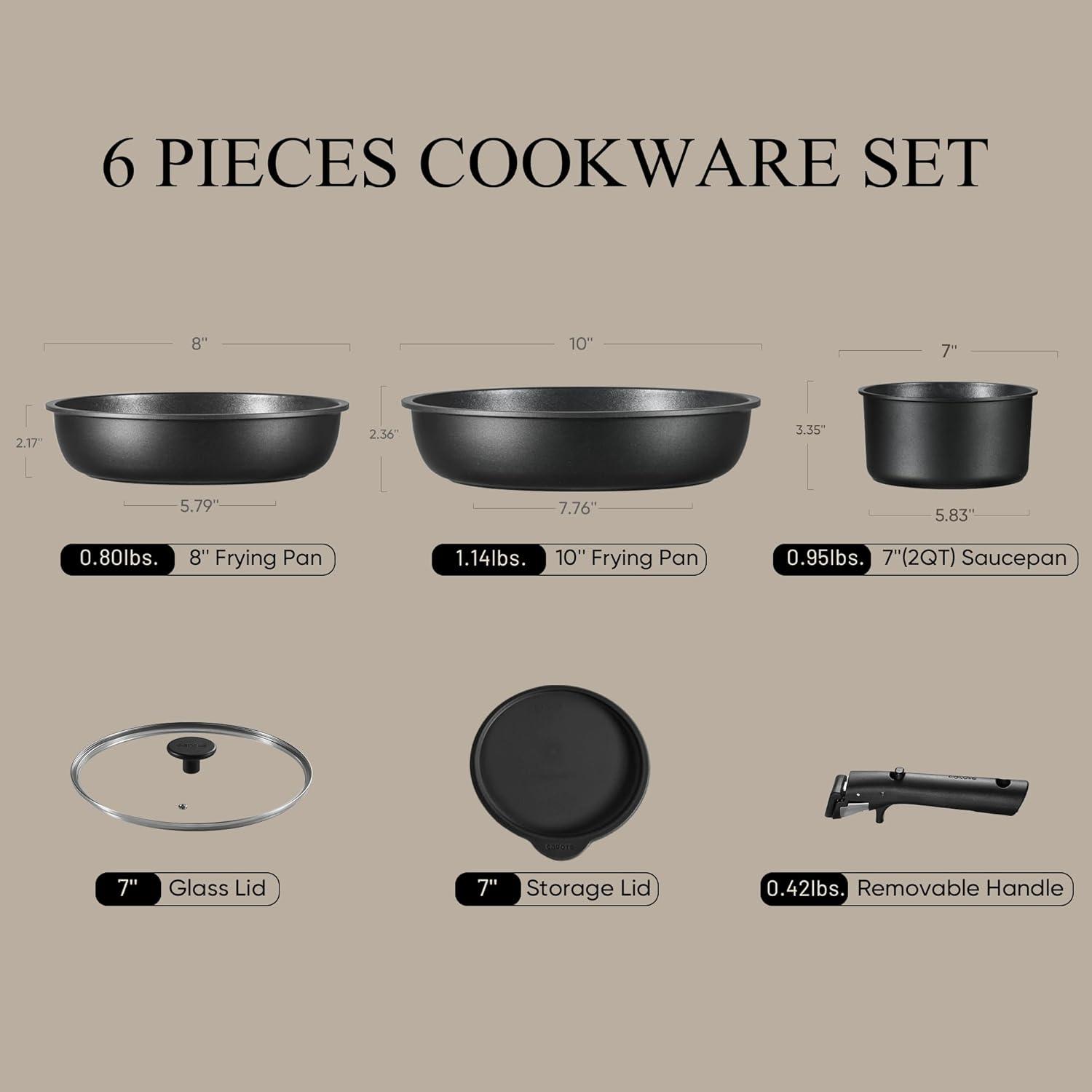 Optimal storage and easy stacking with the handles off saves up to 70% more space of Carote detachable handle pots and pans set.