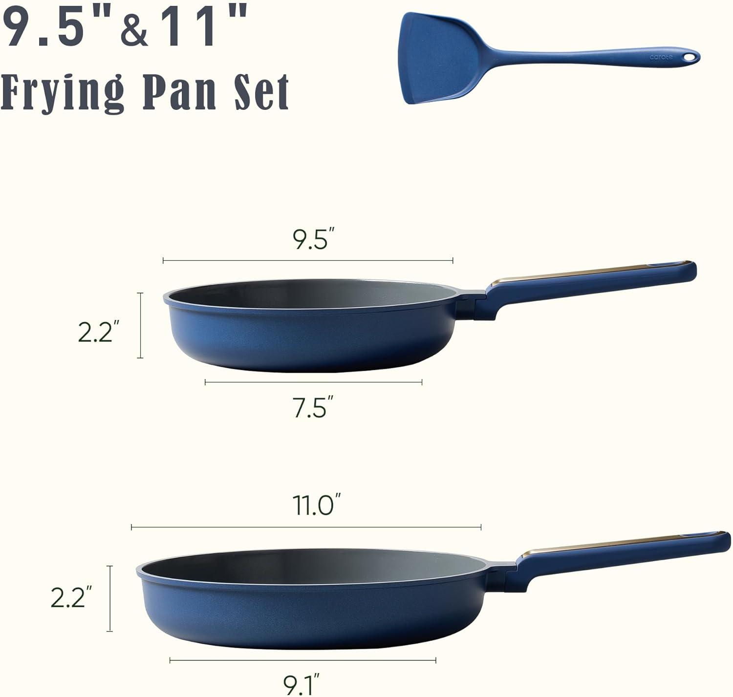 【Frying Pans Set Includes】This nonstick frying pans cookware set includes 9.5-inch pans*1、11-inch pans*1、silicone spatula*1—Perfect for flipping eggs, sautéing veggies, turning pancakes, pansearing chicken, making tacos,and more.