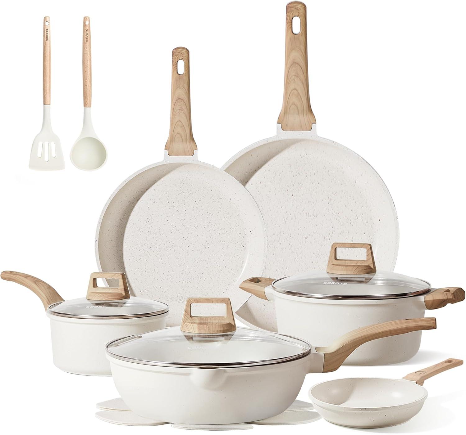 CAROTE Ceramic Cookware Set, 14 PCS Pots and Pans Set Non Stick, Pot and Pan Set with Frying pan, Induction Ready Cooking Set for Kitchen, PFOS/PFOA/PFAS Free, Pink(Cream White)