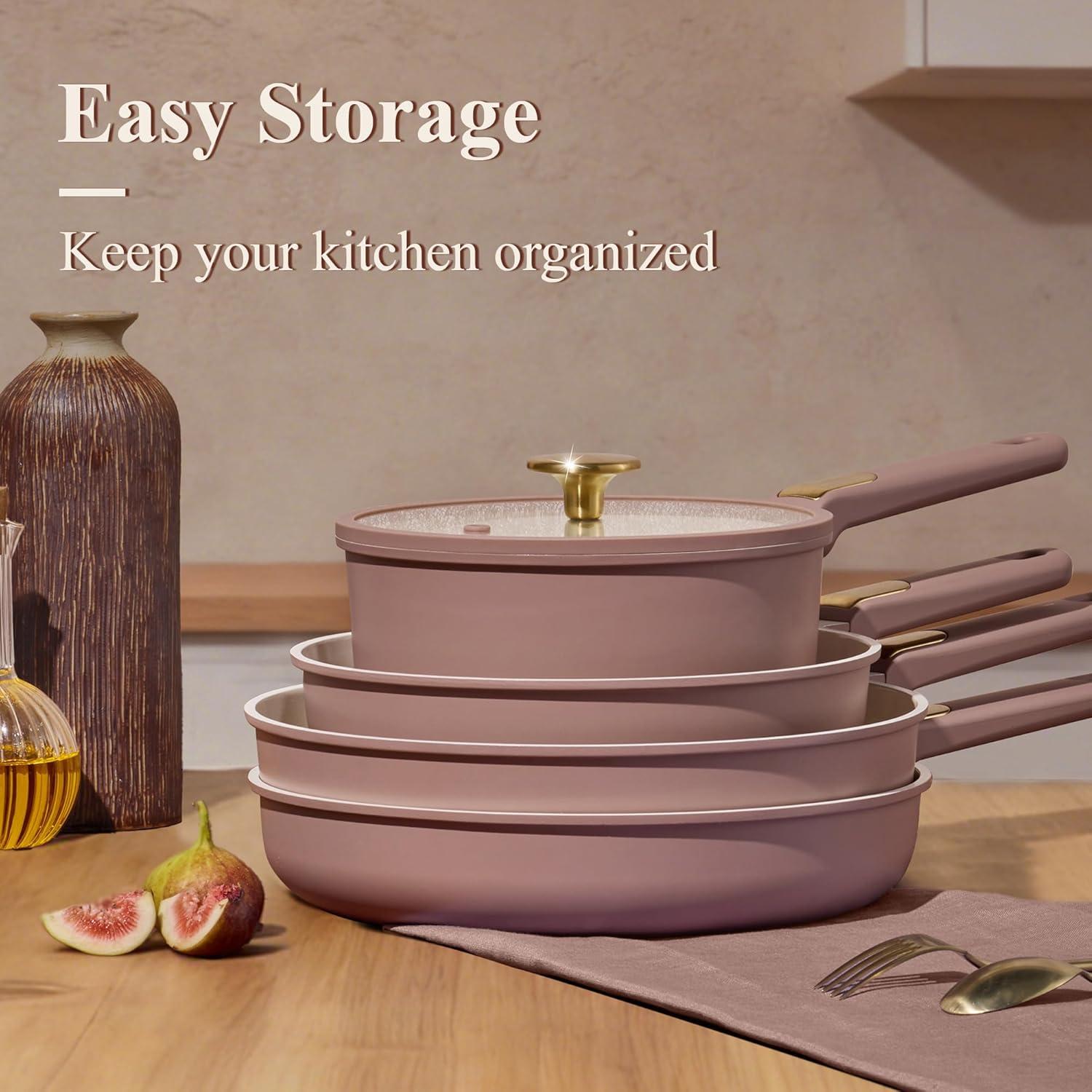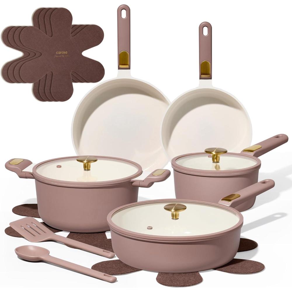 CAROTE Ceramic Cookware Set, 14 PCS Pots and Pans Set Non Stick, Pot and Pan Set with Frying pan, Induction Ready Cooking Set for Kitchen, PFOS/PFOA/PFAS Free, Pink(Pink)