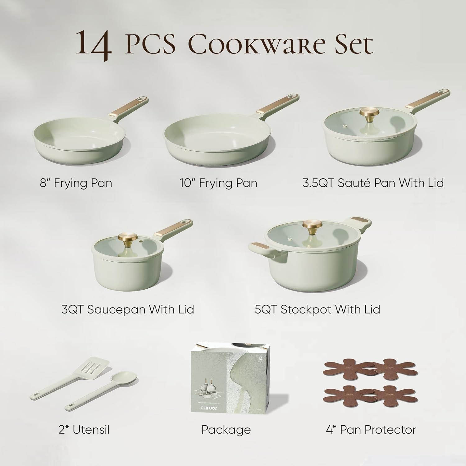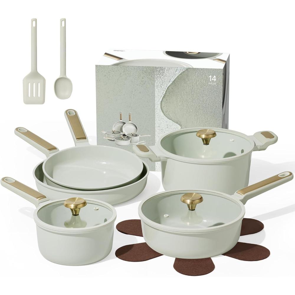 CAROTE Ceramic Cookware Set Nonstick, 14pcs Pots and Pans Set Nonstick, Non-Toxic & PFAS-Free, Dishwasher/Oven Safe, RV/Camping Cookware Set, Cooking Pots with Lids, Blue(Green)