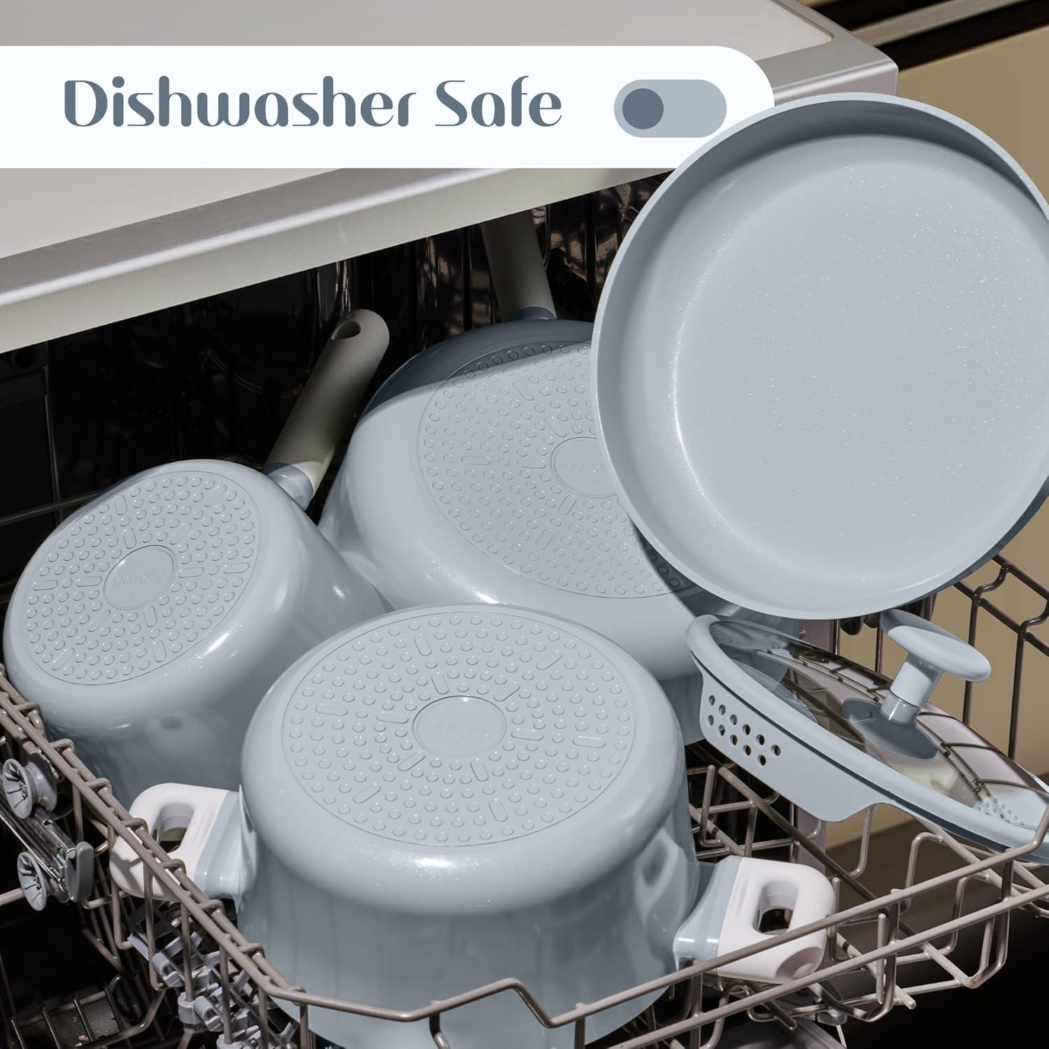 HEALTHY CERAMIC COOKWARE SET – Ceramic non-stick surface, safe and non toxic, free of PFOA, PTFE, PFAS, PFOS, lead, cadmium and other toxic substances that can leach into food.The reinforced die-cast aluminum construction of this kitchen pots and pans set make it resistant to wear and tear, allowing it to with stand frequent usage without compromising its performance.