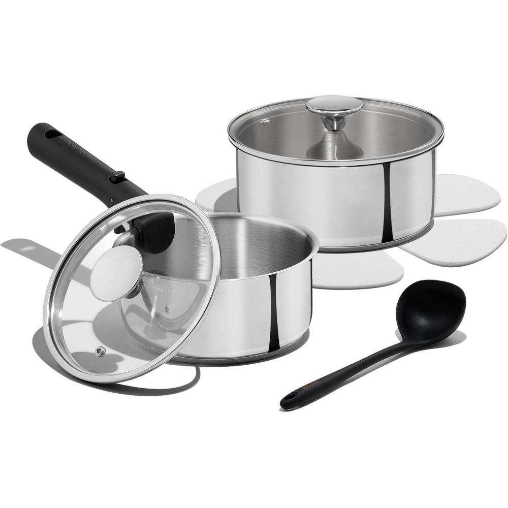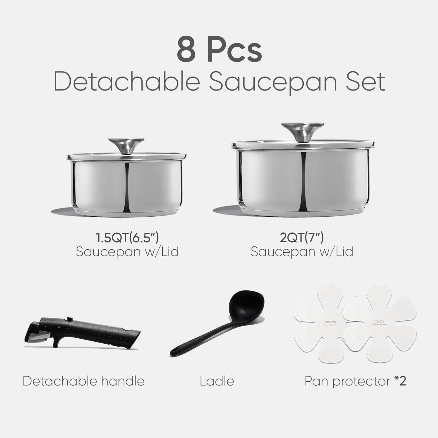 6. 【8pcs Set Includes】 1.5QT saucepan with lid, 2QT saucepan with lid, 1*detachable handle, 1*ladle, 2*pan protector