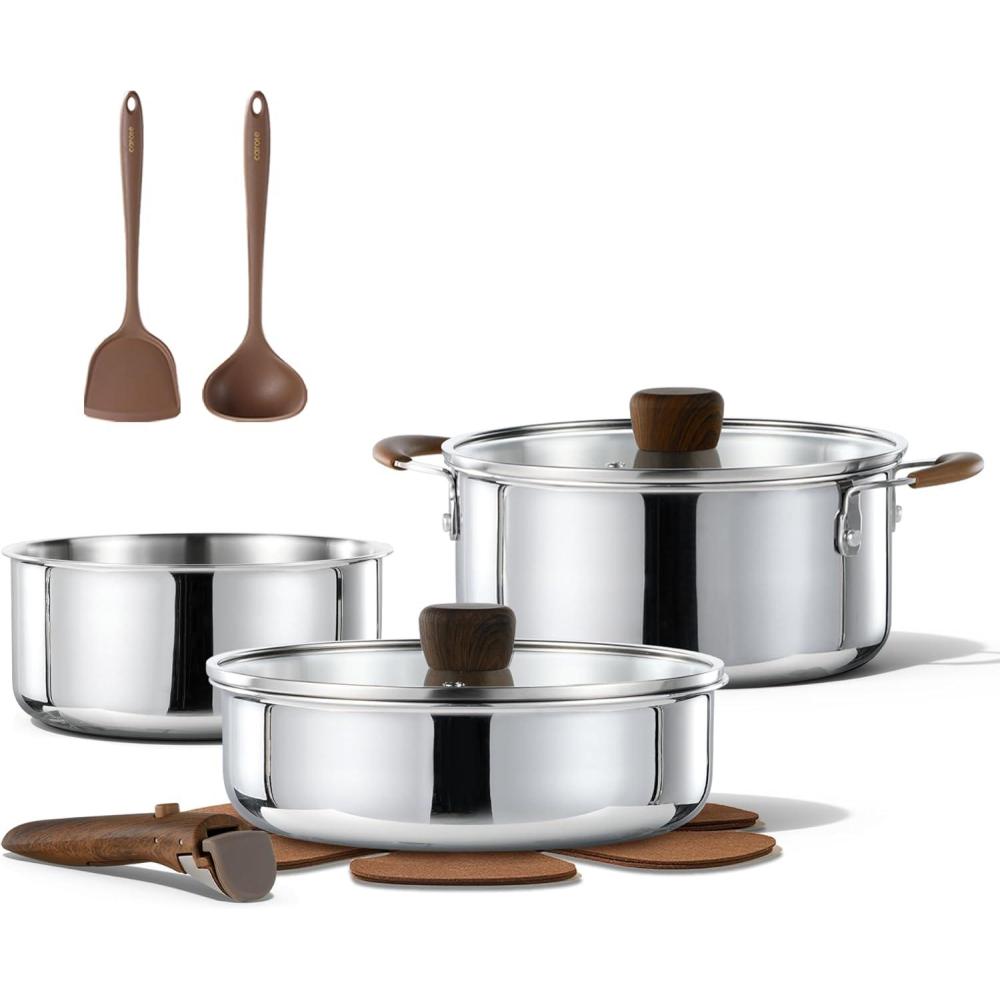 CAROTE Tri-Ply Stainless Steel Sauce Pan with Detachable Handle,1.5QT Saucepan,2QT & 3QT Saucepan with Lid, 8PCS Non-Toxic Induction Kitchen Stainless Steel Pot,Removable Handle,Oven Safe,Woodgrain(10pcs)
